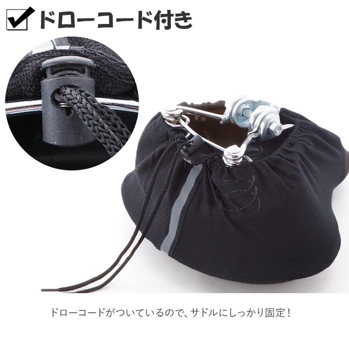 ※サドルへ装着する際は、紐を硬く絞ってください。紐が緩いとカバーのずれや巻き込みの原因となります。