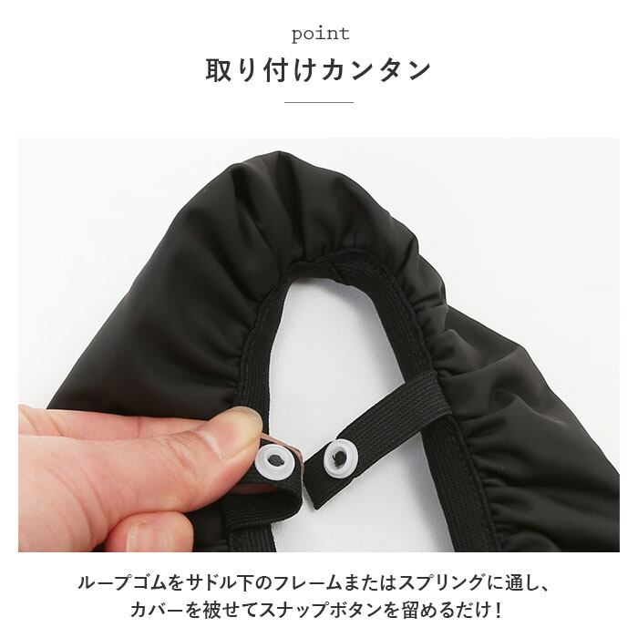 ・ループゴムをサドル下のフレームまたはスプリングに通し、カバーを被せてスナップボタンを留めるだけ!