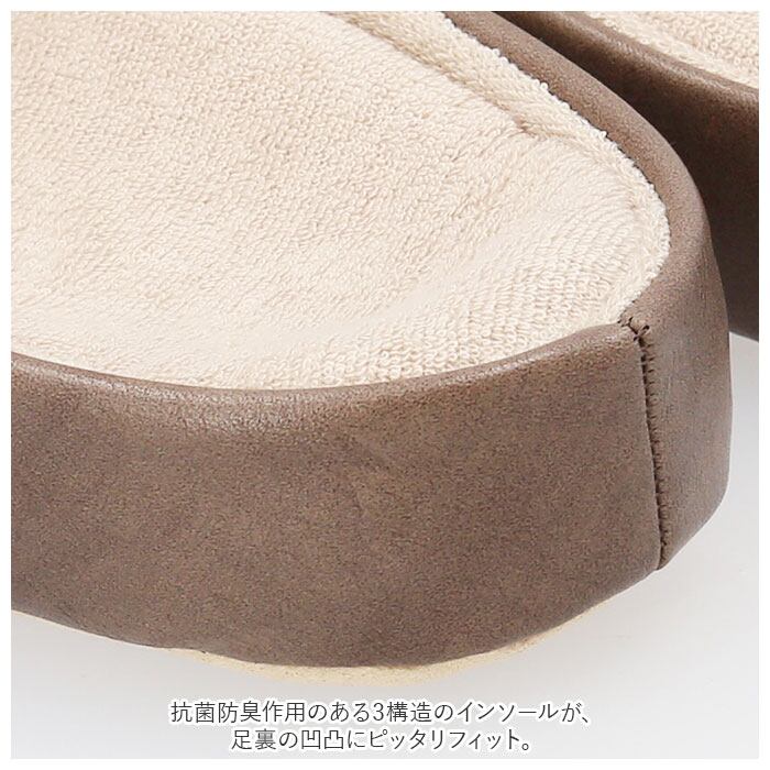 ・つま先まで包み込むラウンドトゥタイプ。肌が当たる部分にはパイル生地を使用しているので、素足でも心地よい履き心地。