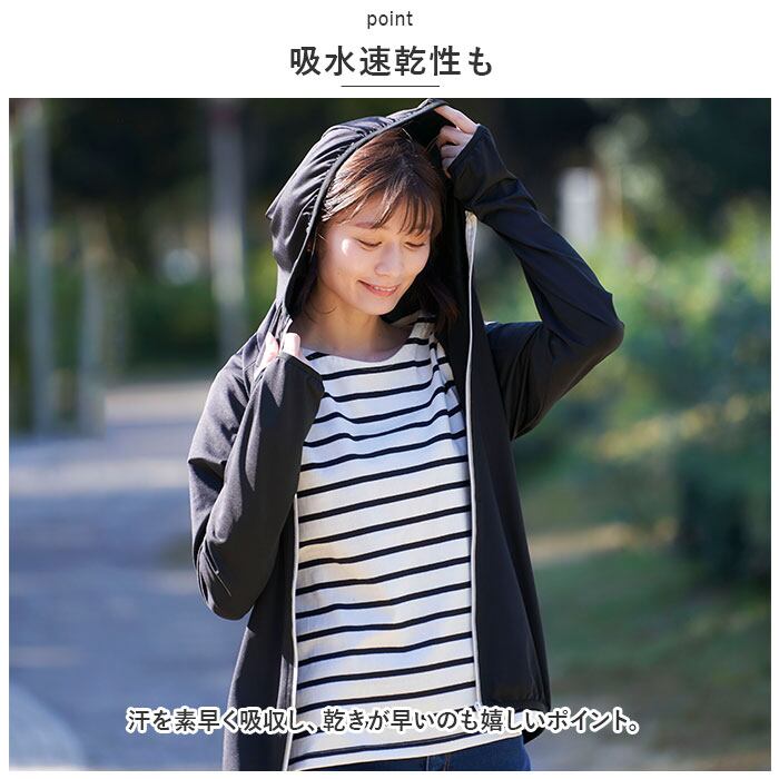 ・UVカット率約99%で気になる紫外線からお肌をガード!首元までカバーできるフードや、手の甲まで覆える親指ホール付き。