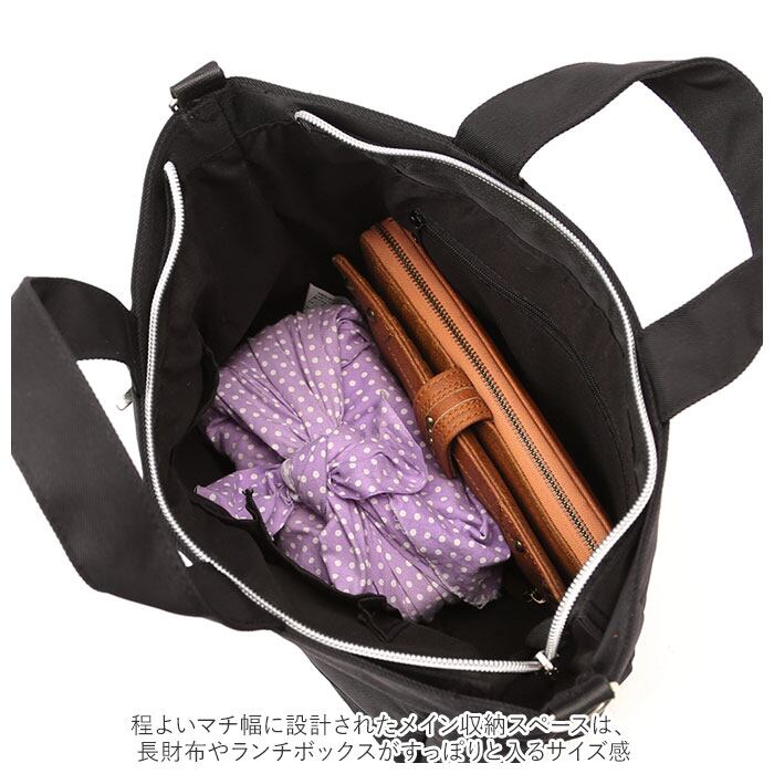 ・程よいマチ幅に設計されたメイン収納スペースは、長財布やランチボックスがすっぽりと入るサイズ感で、ランチトートにオススメ。