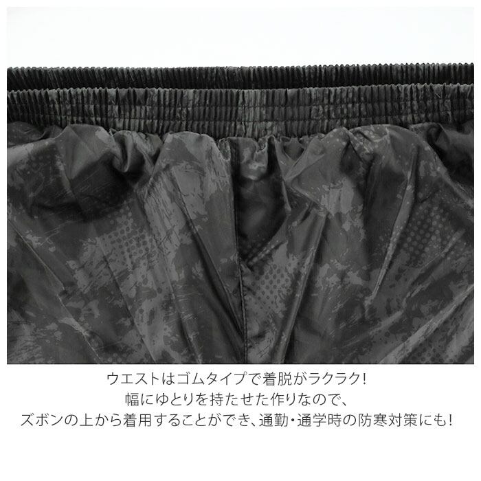 ・ウエストはゴムタイプで着脱がラクラク!幅にゆとりを持たせた作りなので、ズボンの上から着用することができ、通勤・通学時の防寒対策にも!