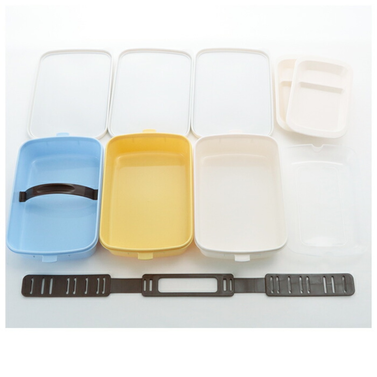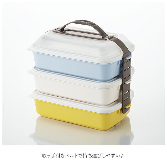 ・取っ手付きベルトで、3段分のランチボックスを安定した状態で持ち運びが出来て、楽ちん。2段だけで使う時もしっかり留められる。