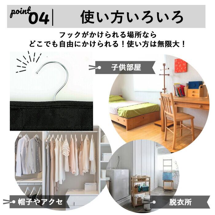 ・ハンガーフックで吊り下げる形状なので、クローゼットのポールに引っ掛けるだけ!狭いスペースでも有効に活用できる便利アイテム。