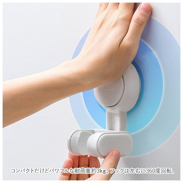 ・使い方はとっても簡単!浴室の壁面にフックを近づけ、PUSHボタンを押しながら壁に押し付けるだけ。直径5.5cmの大きな吸盤でしっかり吸着!