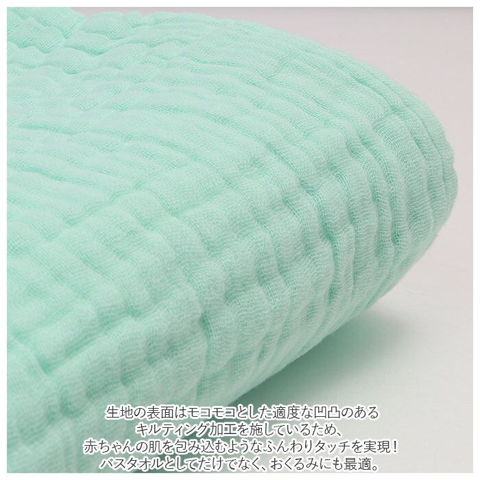 ・生地の表面はモコモコとした適度な凹凸のあるキルティング加工を施しているため、赤ちゃんの肌を包み込むようなふんわりタッチを実現!バスタオルとしてだけでなく、おくるみにも最適。