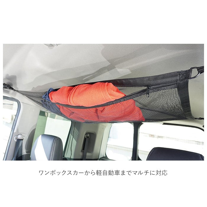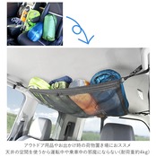 ・アウトドア用品やお出かけ時の荷物置き場におススメ。天井の空間を使うから運転中や乗車中の邪魔にならない。(耐荷重約4kg)