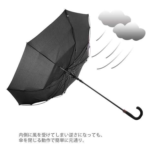 親骨に通常より太いグラスファイバー骨を使用し、受骨も特殊な二重構造式で強度がアップしています。強風でひっくり返っても元に戻る!耐風骨仕様のワンタッチ・ジャンプ式です。木調の化粧板と滑り止めの施されたスタイリッシュで持ちやすいグリップも印象的な、大人のためのハイグレードな傘です。