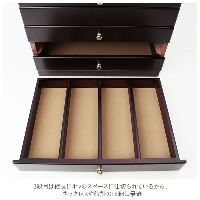 3段目は縦長に4つのスペースに仕切られているから、ネックレスや時計の収納に最適。