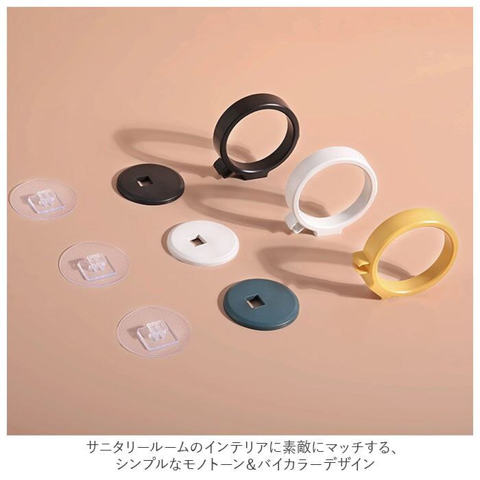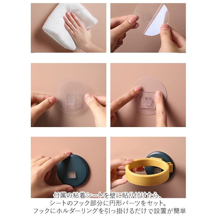 ・付属の粘着シートを壁に貼り付けたら、シートのフック部分に円形パーツをセット。フックにホルダーリングを引っ掛けるだけで設置が簡単。