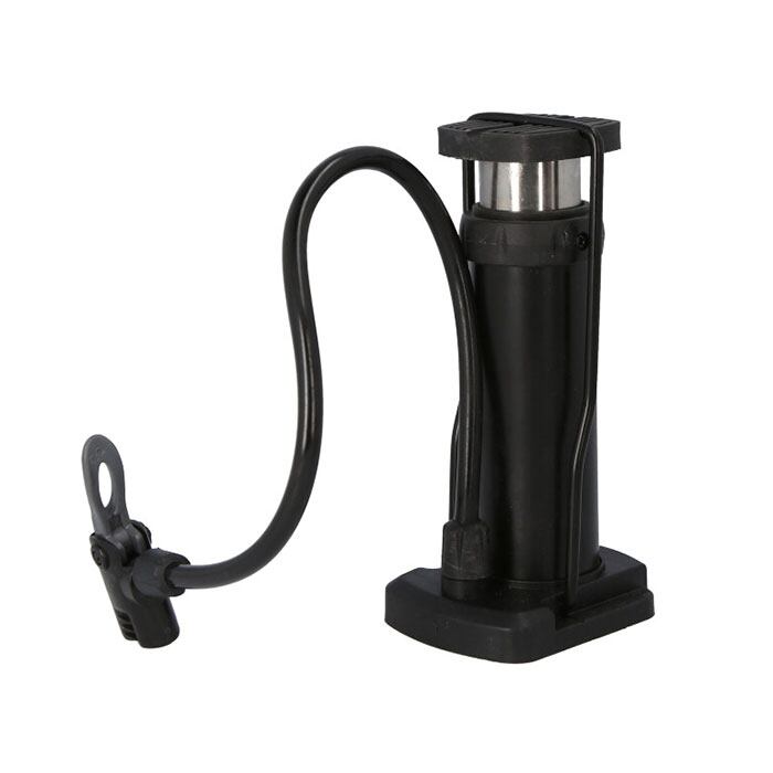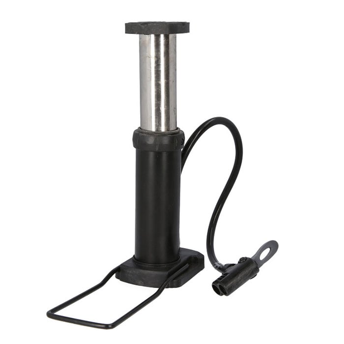 ・折りたたみ式スチールスタンドを片脚で支え、もう一方の脚でポンプを踏む込む、シンプルタイプの空気入れ。足踏みタイプだから力が入れやすいのがポイント!