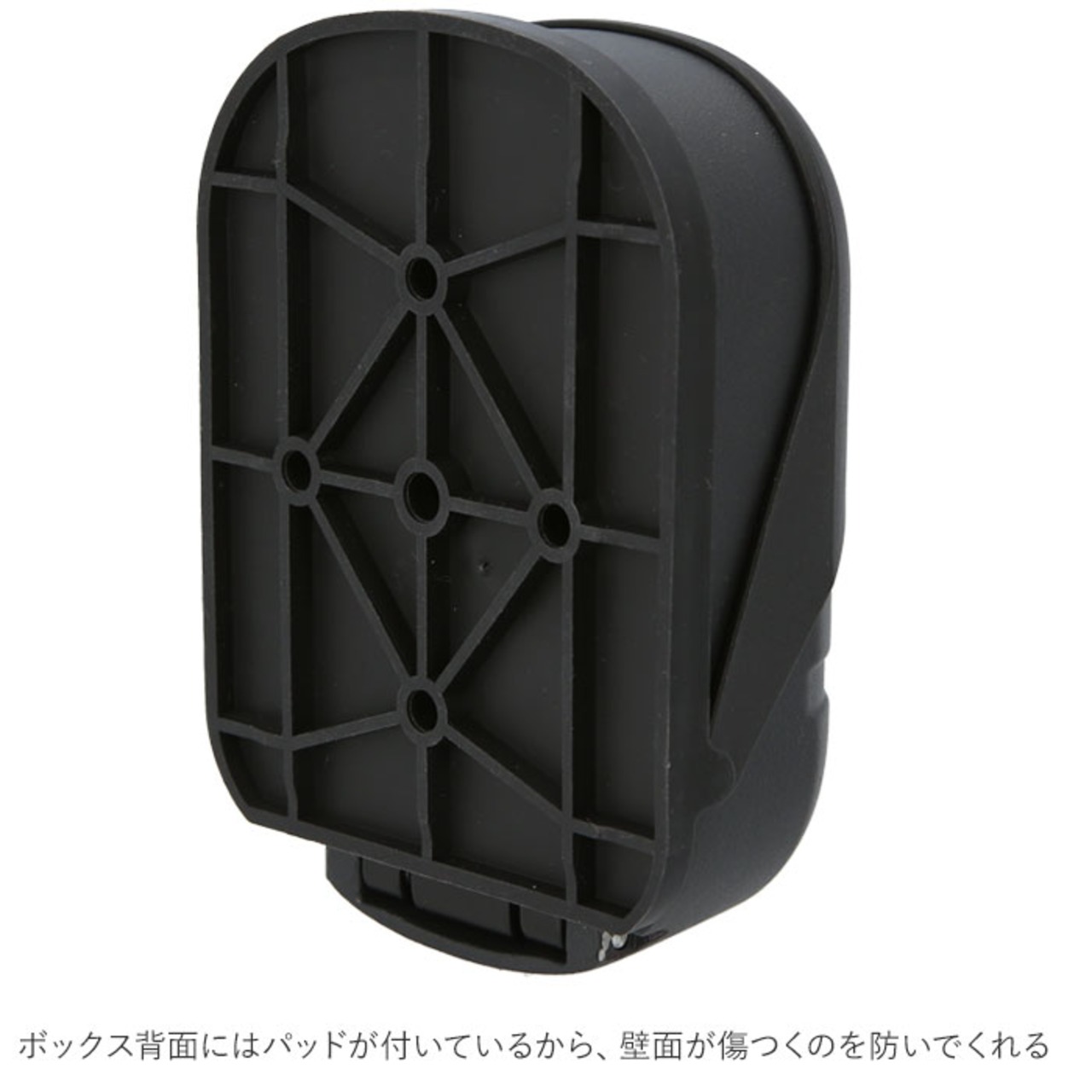 ・付属のネジをボックス内の穴から打ち込めば、壁掛けも可能。ボックス背面にはパッドが付いているから、壁面が傷つくのを防いでくれる。