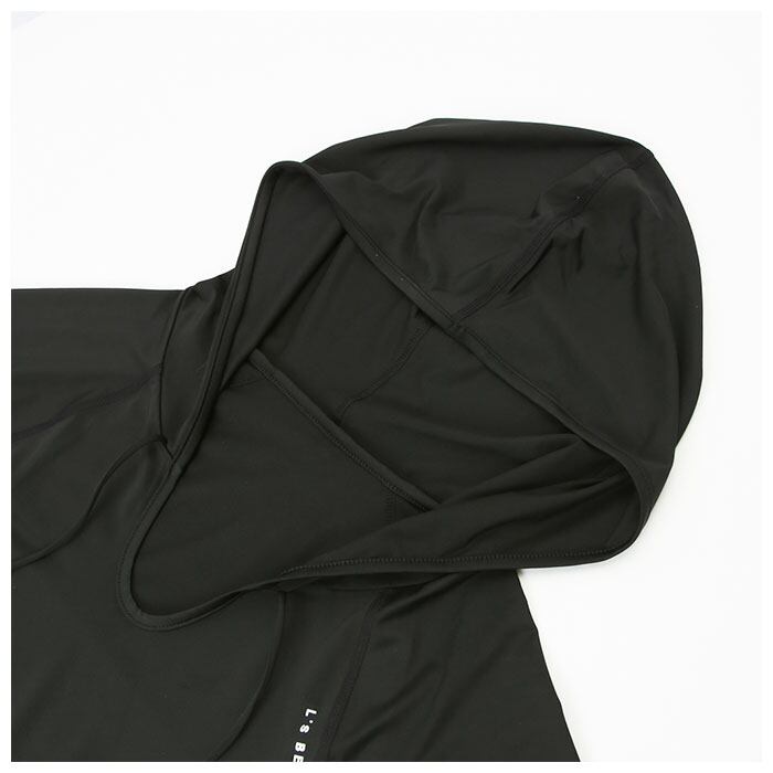 ・深すぎないVネックラインとフードが小顔&デコルテ美人に。