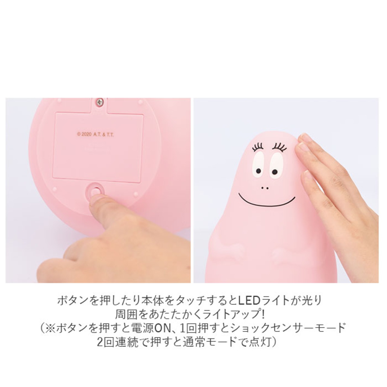 ・ボタンを押したり本体をタッチするとLEDライトが光り、周囲をあたたかくライトアップ。(※ボタンを押すと電源ON、1回押すとショックセンサーモード、2回連続で押すと通常モードで点灯。)
