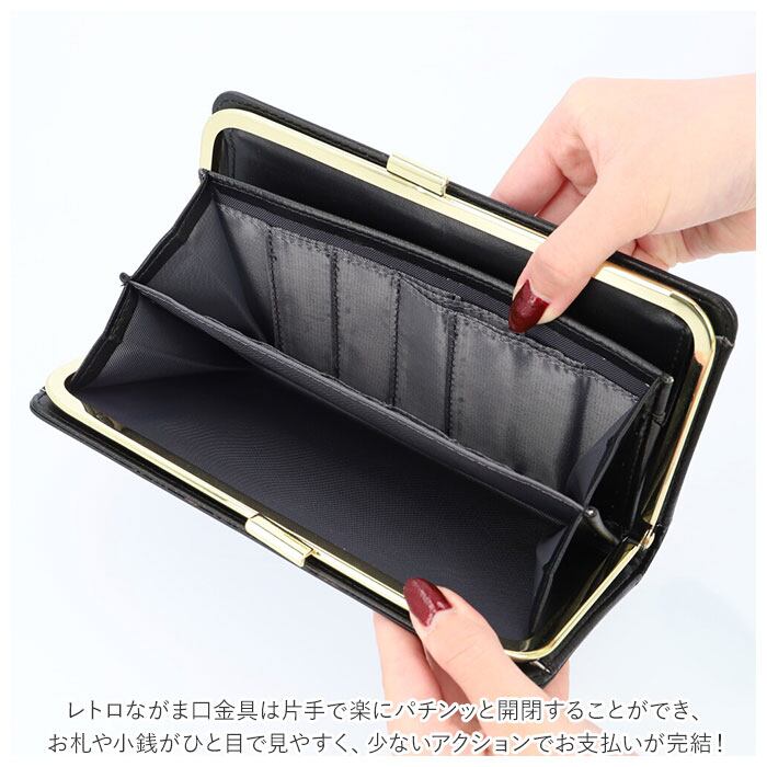 ・レトロながま口金具は片手で楽にパチンッと開閉することができ、お札や小銭がひと目で見やすく、少ないアクションでお支払いが完結!