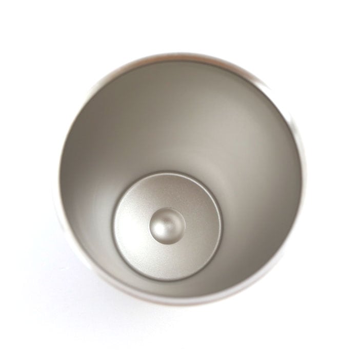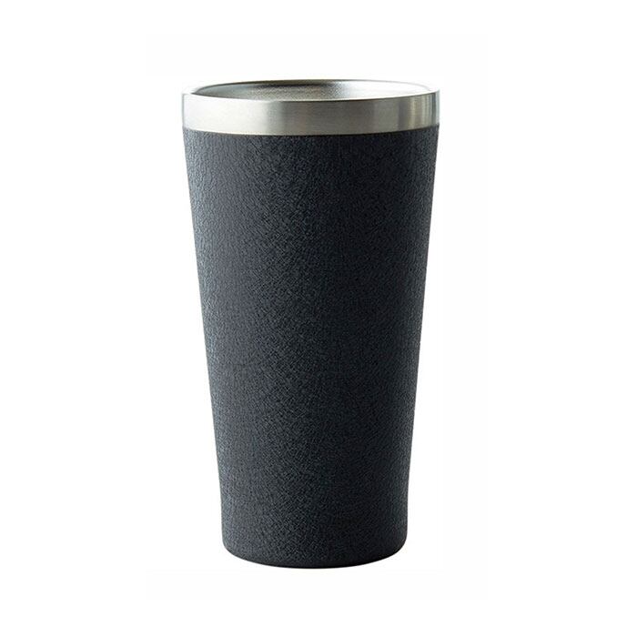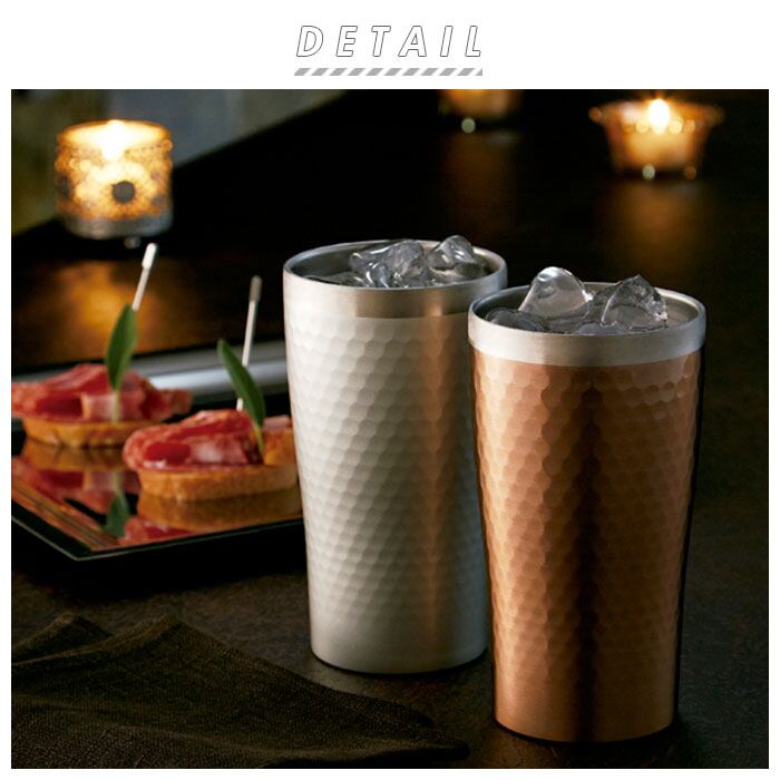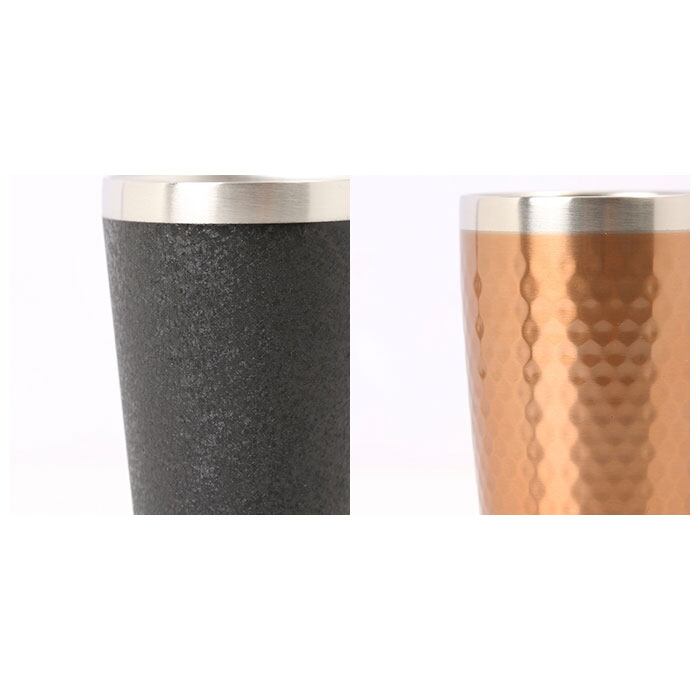 ・表面は高級感のある打ち出し加工仕上げでツヤのあるメタリック調と、細かい凹凸でツヤのないマットタイプの2種類。飲み口がシルバー色に縁取られたスタイリッシュなデザイン。