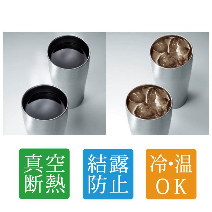 ・本体内側と外側が真空断熱されたステンレス二重構造タイプ。熱い飲み物を入れてタンブラーを持っても表面が熱くなく、冷たい飲み物を注いだ時の結露も出にくいのがポイント!
