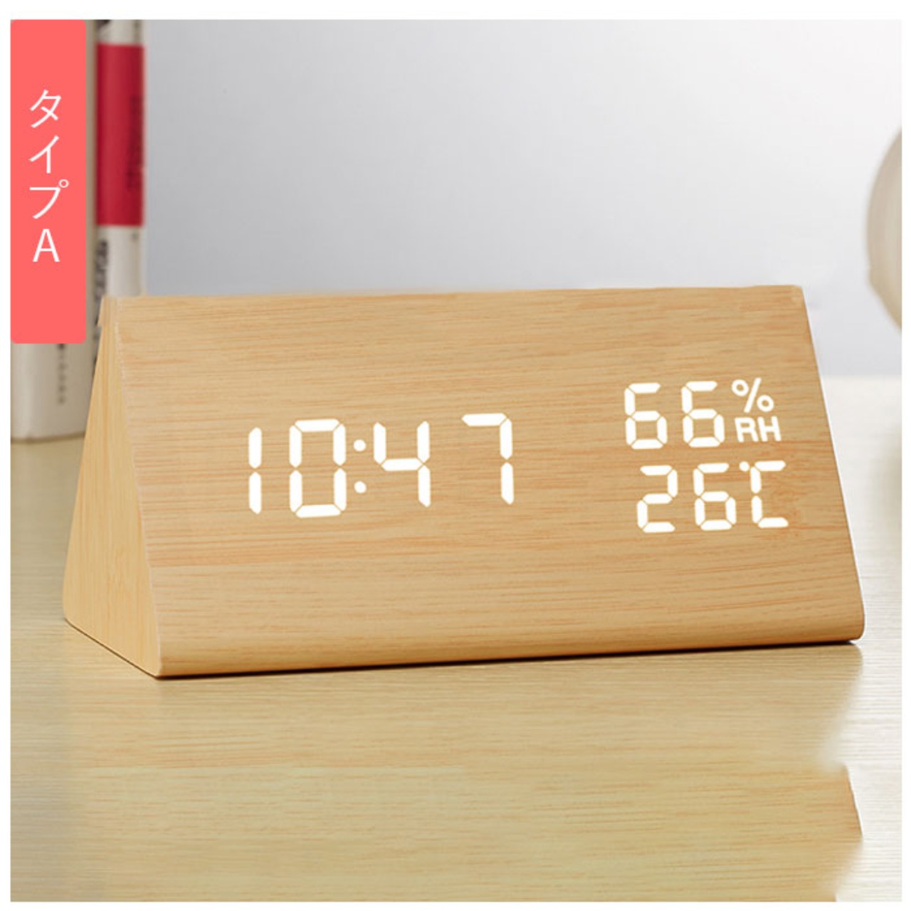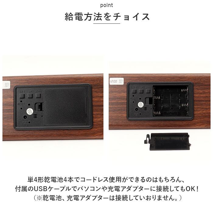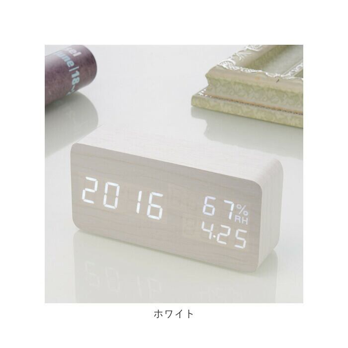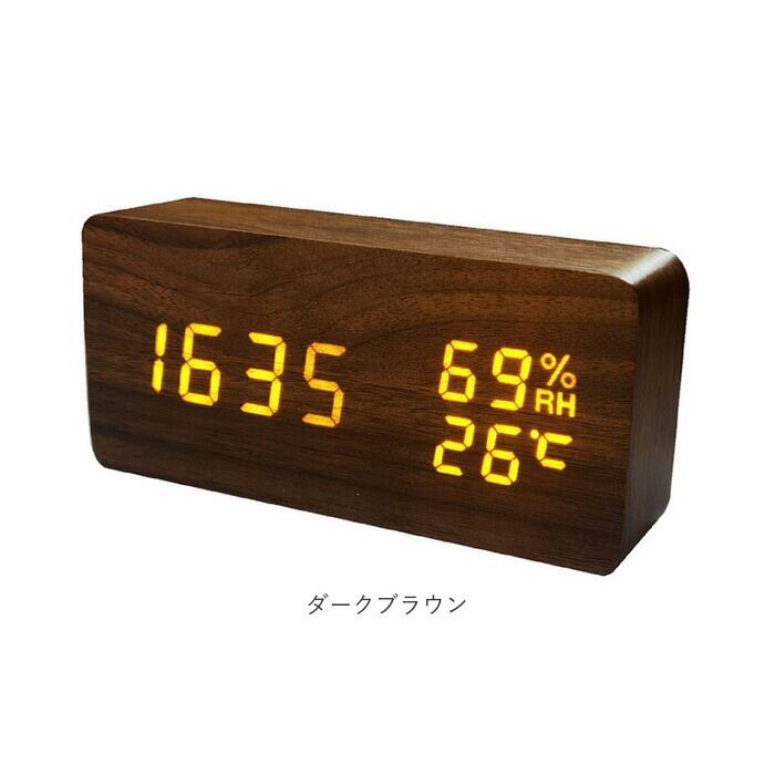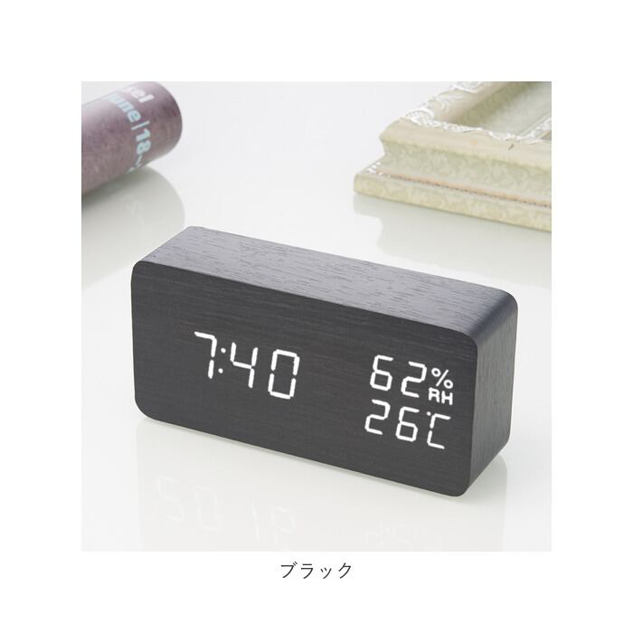 ・木肌のように滑らかなボディ表面に、「現在時刻」「湿度」「温度」を明るいLEDライトで見やすく表示。