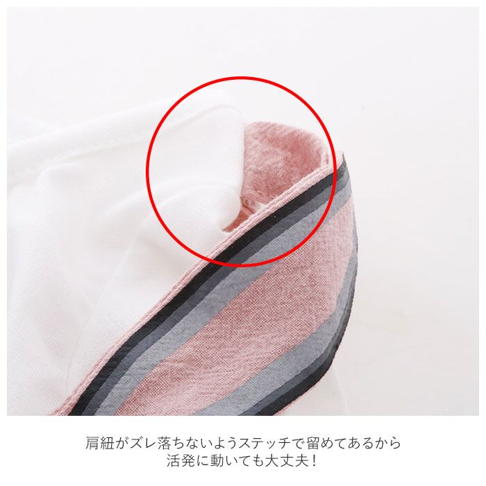 ・肩紐がズレ落ちないようステッチで留めてあるから、活発に動いても大丈夫!