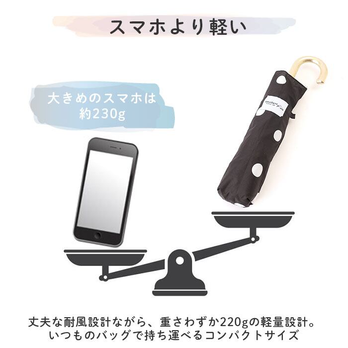 ・丈夫な耐風設計ながら、重さわずか220gの軽量設計。いつものバッグにちょこんと差し込んで持ち運べるコンパクトサイズ。
