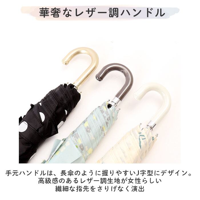 ・手元ハンドルは、長傘のように握りやすいJ字型にデザイン。高級感のあるレザー調生地が女性らしい繊細な指先をさりげなく演出。