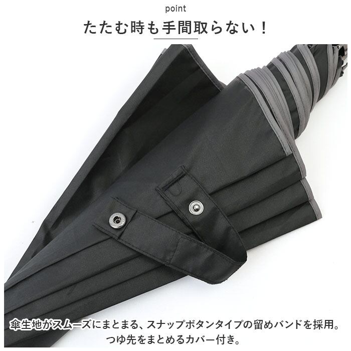 ・傘生地がスムーズにまとまる、スナップボタンタイプの留めバンドを採用。つゆ先をまとめるカバー付き。