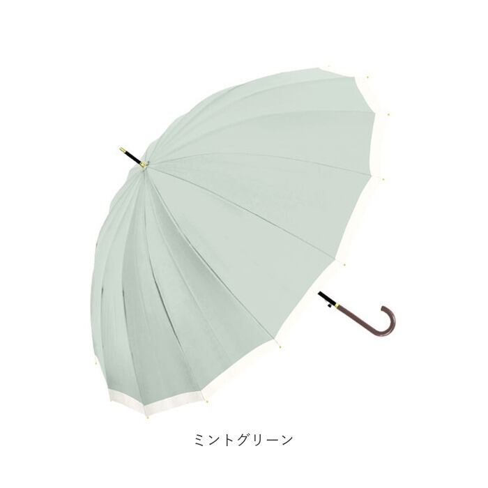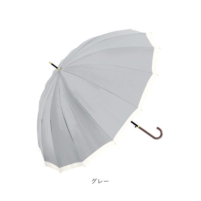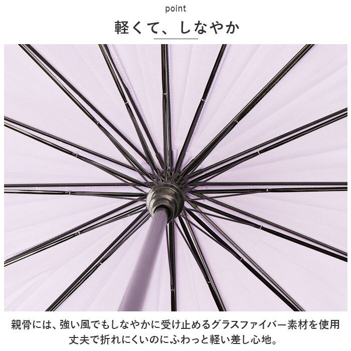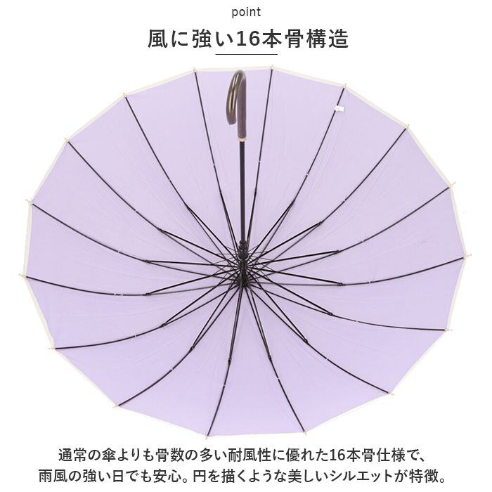 ・通常の傘よりも骨数の多い耐風性に優れた16本骨仕様で、雨風の強い日でも安心。円を描くような美しいシルエットが特徴。
