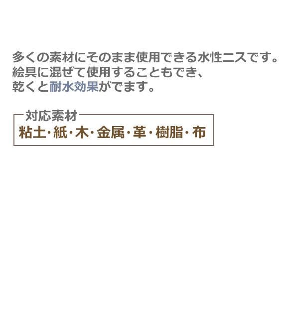 粘土や紙、布、木、金属など多くの素材にそのまま使用できる水性ニスです。絵具に混ぜて使用することもでき、乾くと耐水効果がでます。乾燥時間1時間(20℃)