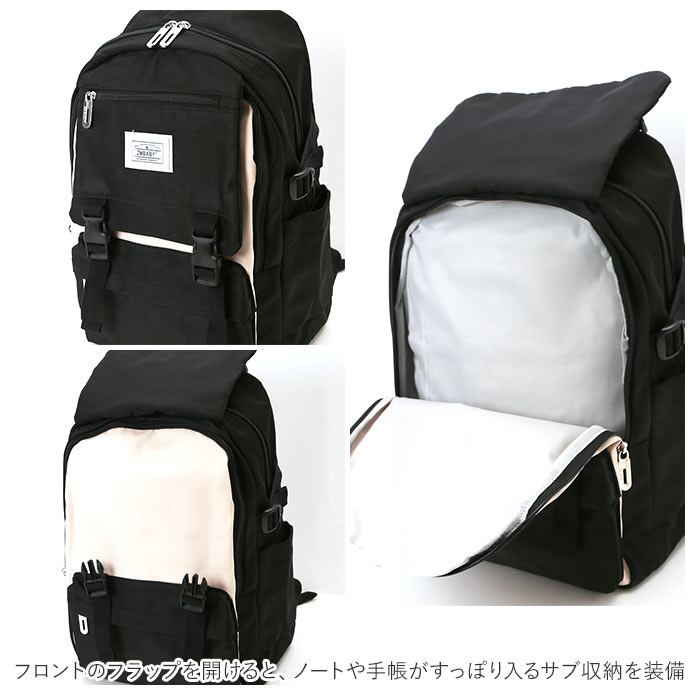 ・フロントのフラップを開けると、ノートや手帳がすっぽり入るサブ収納を装備。