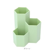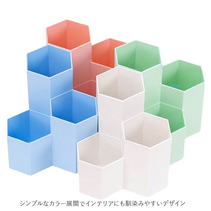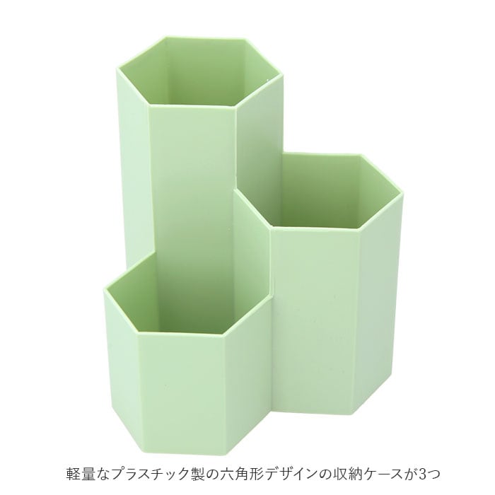 ・軽量なプラスチック製の六角形デザインの収納ケースが3つ。