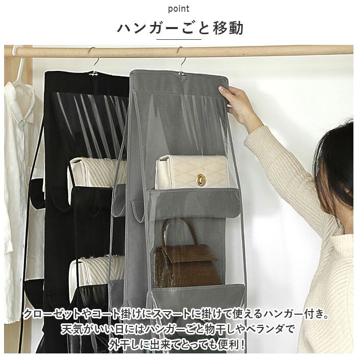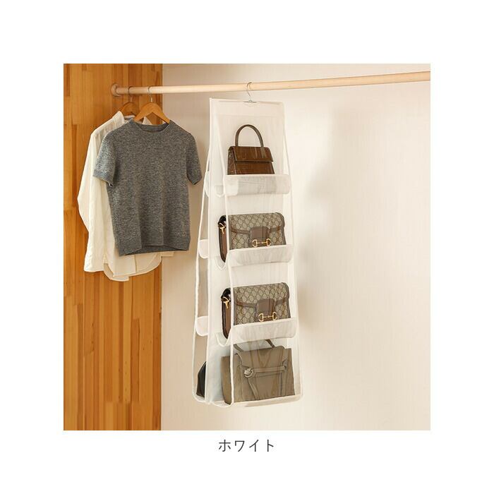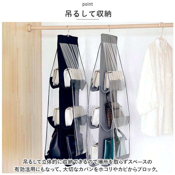 ・吊るして立体的に収納できるので場所を取らずスペースの有効活用にもなって、大切なカバンをホコリやカビからブロック。