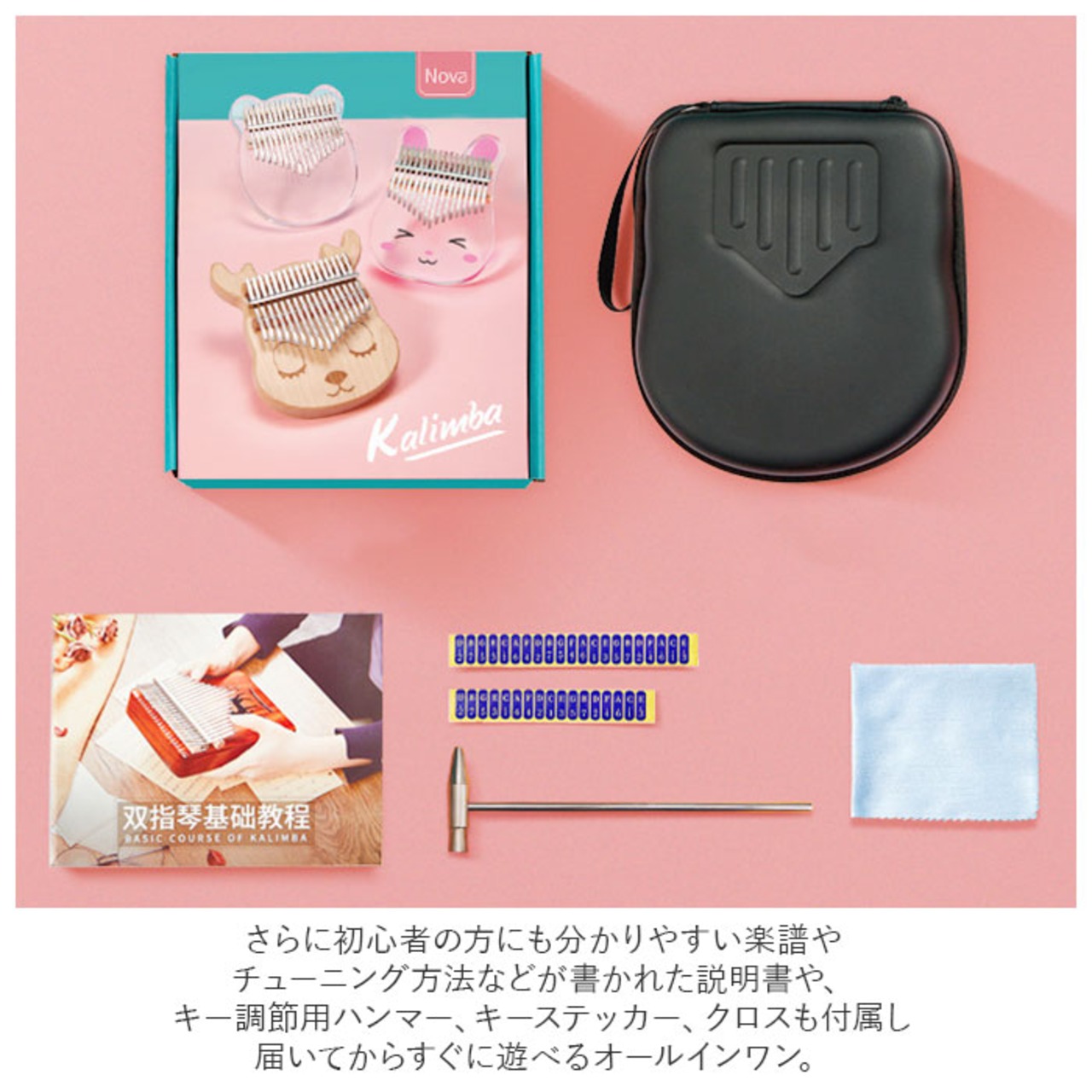 ・さらに初心者の方にも分かりやすい楽譜やチューニング方法などが書かれた説明書や、キー調節用ハンマー、キーステッカー、クロスも付属し届いてからすぐに遊べるオールインワン。