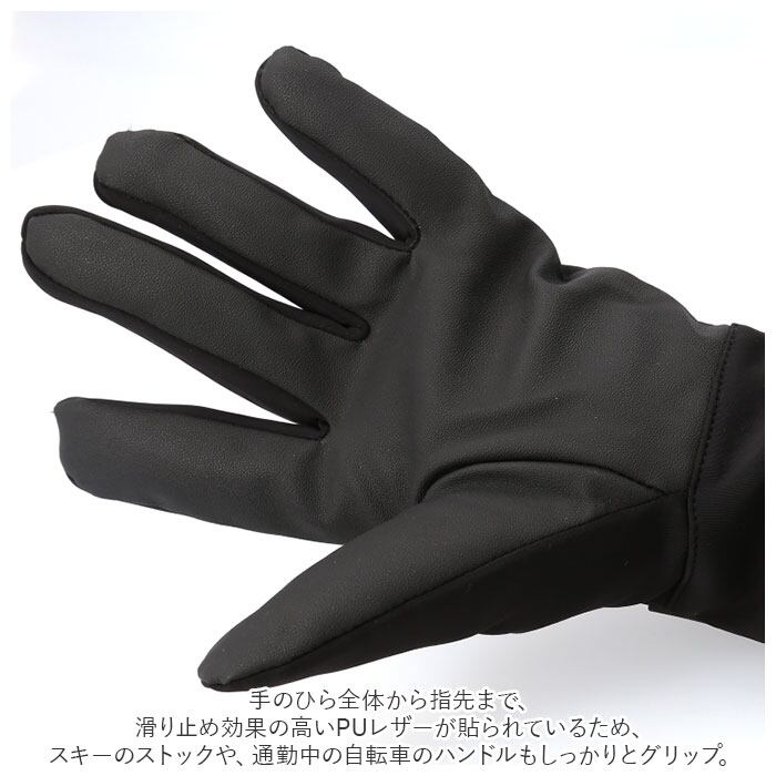 ・手のひら全体から指先まで、滑り止め効果の高いPUレザーが貼られているため、スキーのストックや、通勤中の自転車のハンドルもしっかりとグリップ。