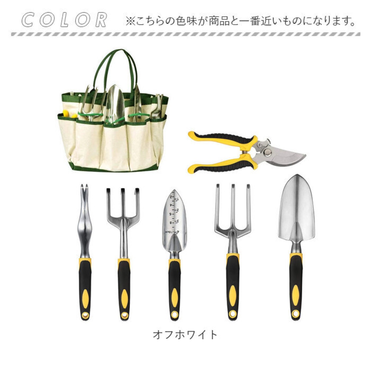 ・ハンドスコップ・移植スコップ・レーキ(熊手)・ハンドフォーク・剪定バサミ・草抜き・専用トートバックの7点を取り揃えた7点セット。