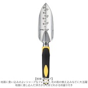・移植スコップ・・・地面に食い込みのよいシャープなフォルムで、花の苗の植え込みなどに大活躍。地面に差し込んだ深さがひと目でわかる目盛り付き。