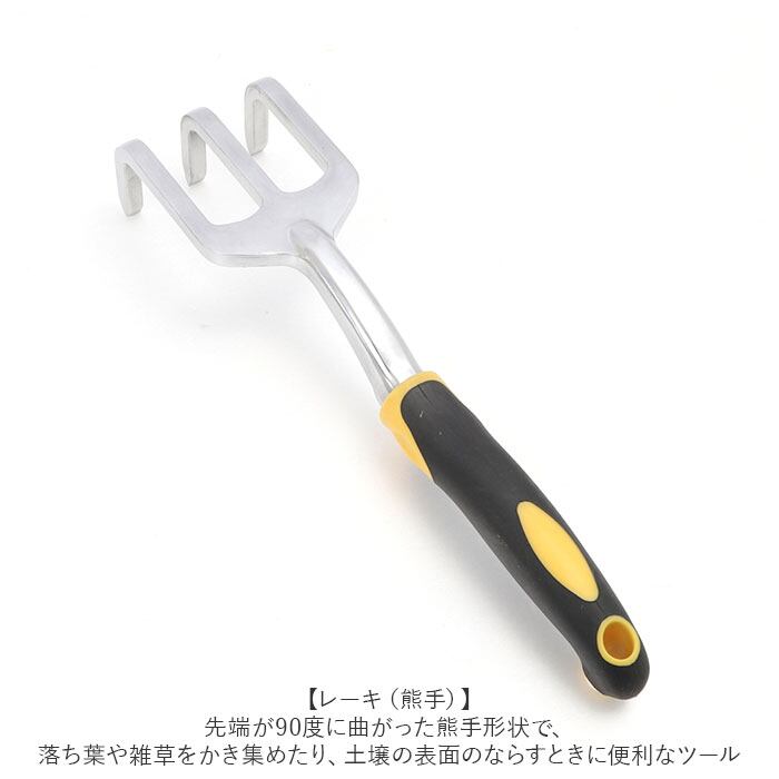 ・レーキ(熊手)・・・先端が90度に曲がった熊手形状で、落ち葉や雑草をかき集めたり、土壌の表面のならすときに便利なツール。