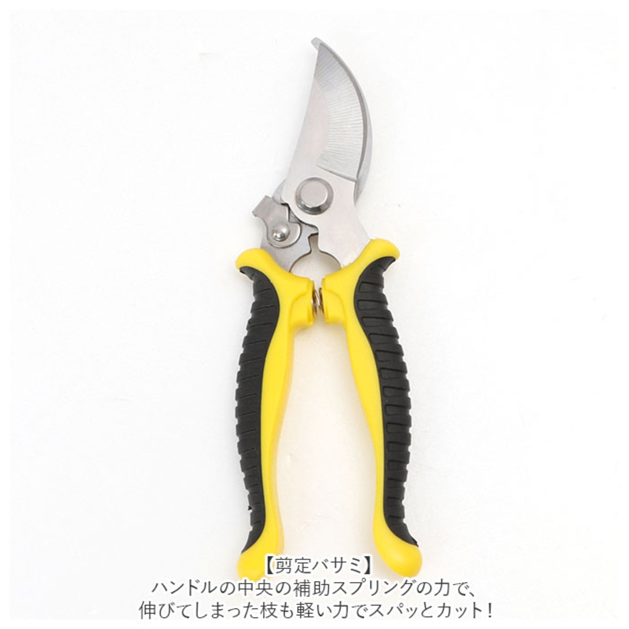 ・剪定バサミ・・・ハンドルの中央の補助スプリングの力で、伸びてしまった枝も軽い力でスパッとカット!刃先を閉じた状態で固定できるストッパー付きだから安全。