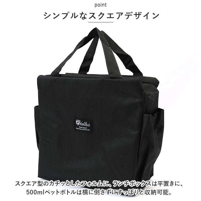・スクエア型のカチッとしたフォルムに、ランチボックスは平置きに、500mlペットボトルは横に倒さずにすっぽりと収納可能。