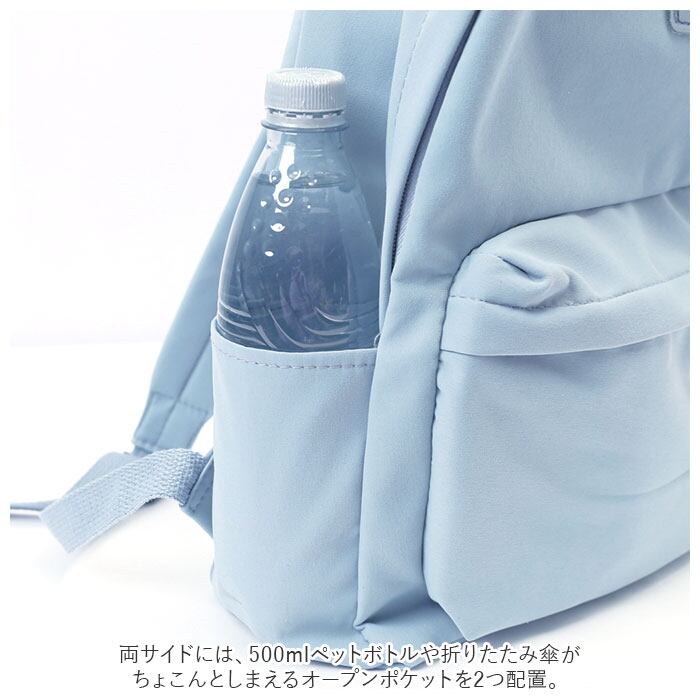 ・両サイドには、500mlペットボトルや折りたたみ傘がちょこんとしまえるオープンポケットを2つ配置。