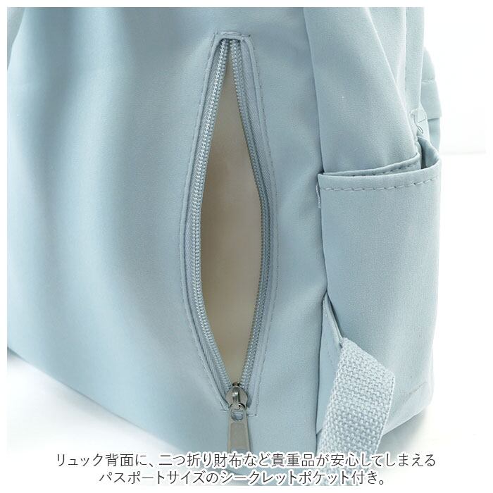 ・リュック背面に、二つ折り財布など貴重品が安心してしまえるパスポートサイズのシークレットポケット付き。