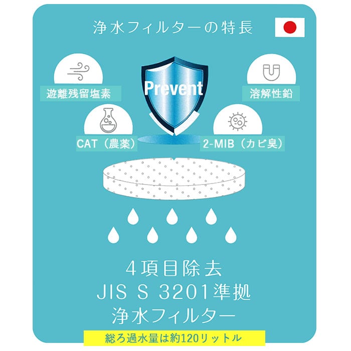 ・遊離残留塩素・2-MIB(カビ臭)・CAT(農薬)・溶解性鉛の4項目を除去する浄水フィルター。総ろ過水量は約120リットル。