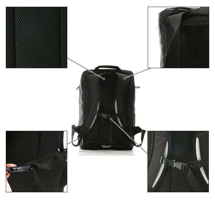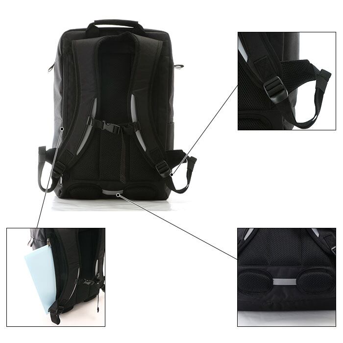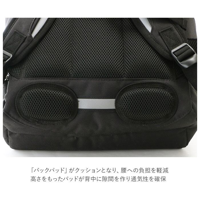 ・「バックパッド」がクッションとなり腰への負担を軽減。高さをもったパッドが背中に隙間をつくり通気性を確保。ネームプレート付き。