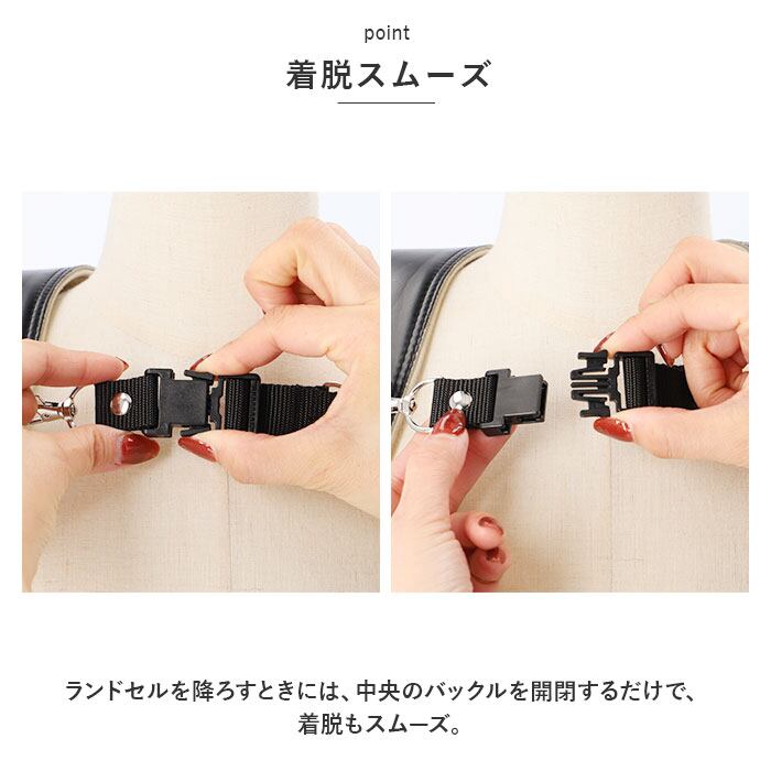 ・ランドセルを降ろすときには、中央のバックルを開閉するだけで、着脱もスムーズ。