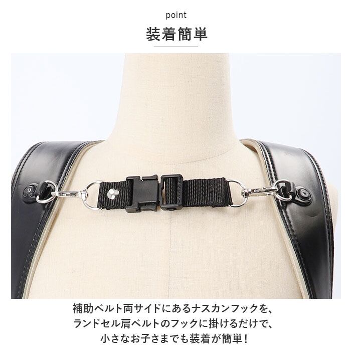 ・補助ベルト両サイドにあるナスカンフックを、ランドセル肩ベルトのフックに掛けるだけで、小さなお子さまでも装着が簡単!