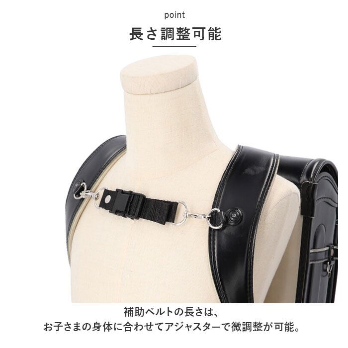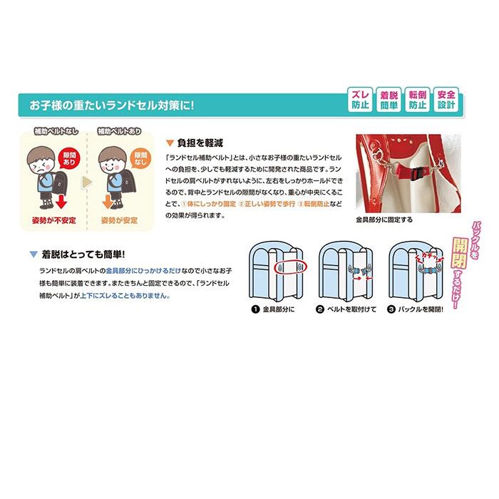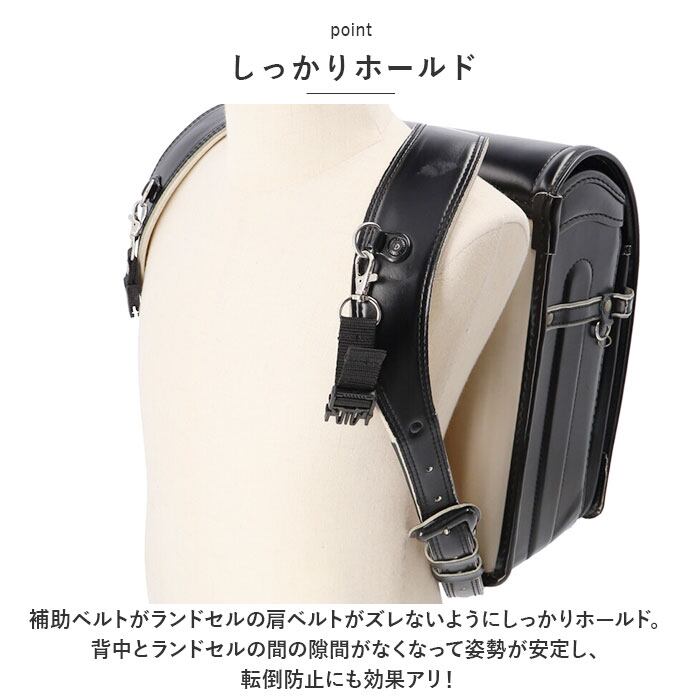 ・補助ベルトがランドセルの肩ベルトがズレないようにしっかりホールド。背中とランドセルの間の隙間がなくなって姿勢が安定し、転倒防止にも効果アリ!