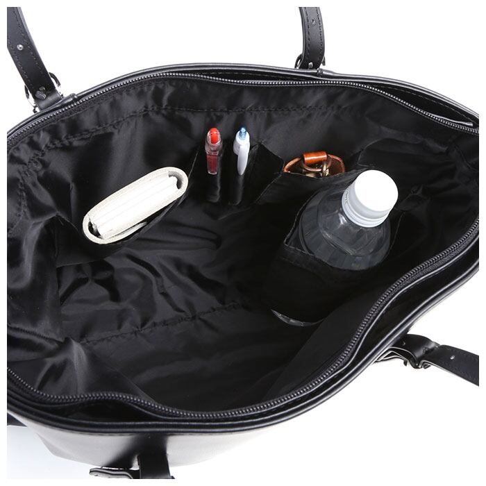 ・メイン収納スペース内側はボトルホルダー付きなので、安定した状態でペットボトルや水筒が収納できる。さらに内側機能ポケット付き(※)でスマホやペンが差せるので荷物の整理整頓ができる。(※オープンポケット×2ヶ所、ペン差し×2ヶ所を装備。)