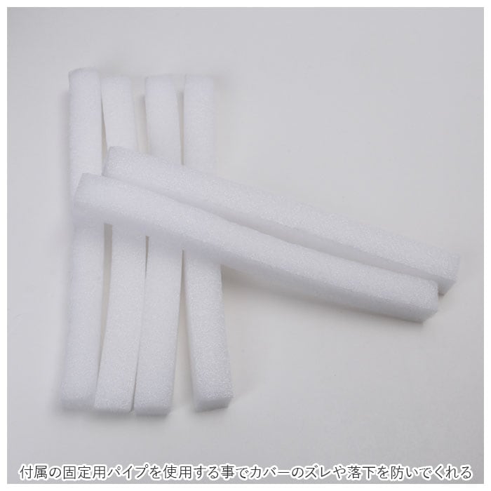 ・カバー裏側の4本の紐を交差させて結び、付属の固定用スポンジパイプを使用する事でカバーのズレや落下を防いでくれる。