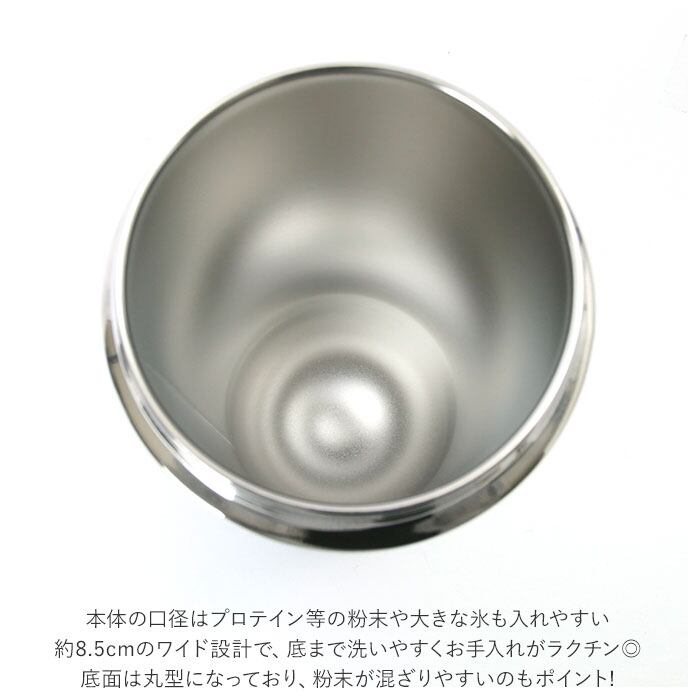 ・本体の口径はプロテイン等の粉末や大きな氷も入れやすい、約8.5cmのワイド設計。底まで洗いやすく、お手入れがラクチン◎