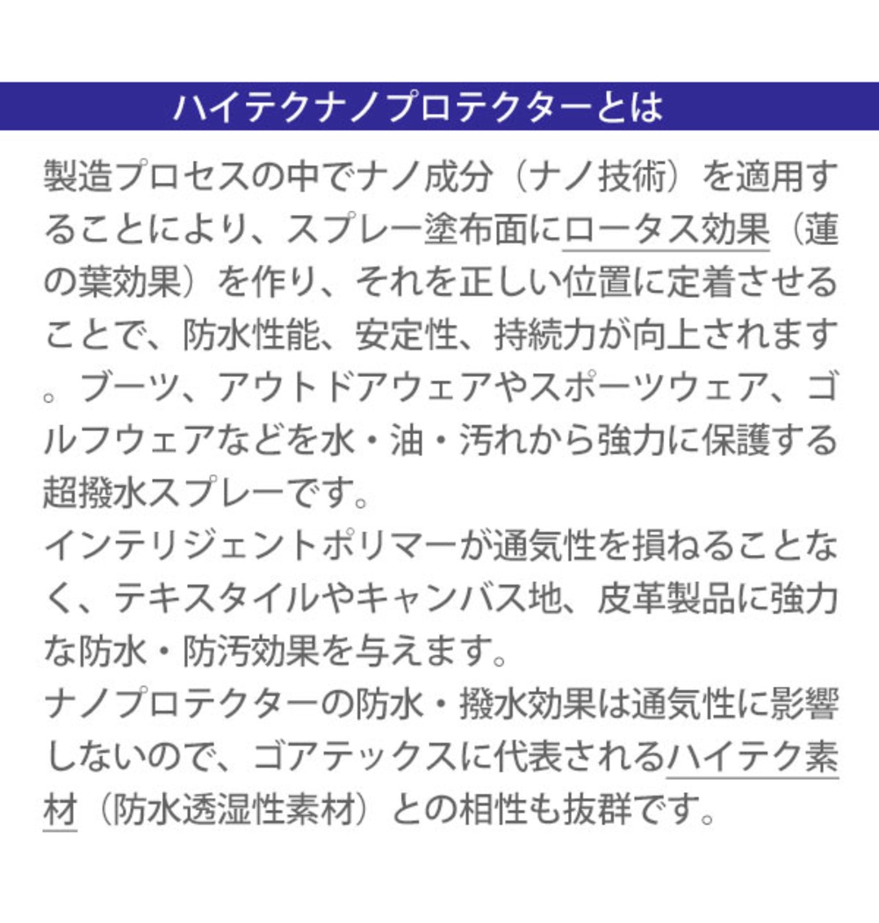 ナノ技術により生み出されるインテリジェントポリマーが通気性を損ねることなく、テキスタイルや皮革製品に強力な防水・防汚効果を与えます。オフタイムに活躍するブーツ用、アウトドアウエアやスポーツウエアなどを水・油・汚れから強力に保護する超撥水スプレーです。また、ゴアテックスに代表されるハイテク素材(防水透湿性素材)との相性抜群です。