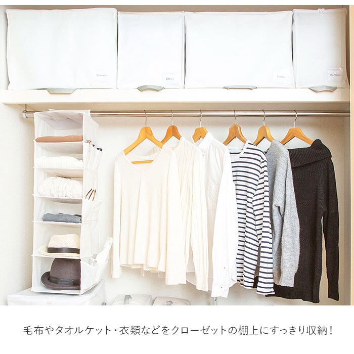 ・毛布やタオルケット・衣替えで整理した衣類等を、クローゼットの棚上にすっきり収納できる収納袋。